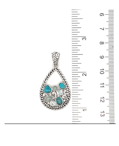 The gemstone pendant combines geometric artistry with the healing energy of stones, specifically known for their calming qualities. Associated with the throat chakra, a beautiful combination of Blue Topaz, Amazonite, and reconstituted Turquoise stones is set in a mix of geometric shapes.
