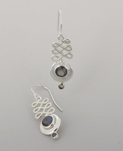 The unalome symbol is a winding line that represents the path to spiritual enlightenment. The Moon represents our journey, and the labradorite gemstone signifies insight and intuition. All come together in these artistic sterling silver earrings.