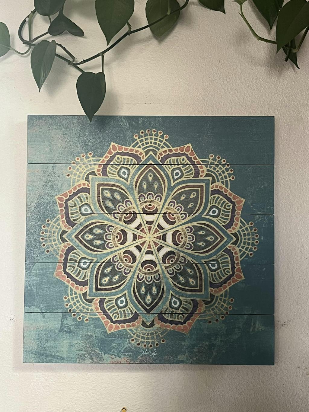 Bring sacred symmetry and balance into your space with this vibrant mandala wall hanging. Printed directly onto North American wood, the mandala radiates intricate energy and soulful design, inviting mindfulness and inner harmony. Its floating mount effect gives the piece an elegant lift, creating visual depth and a peaceful focal point.