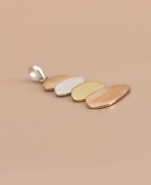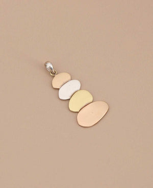 This mixed metal cairn pendant beautifully combines bronze, copper, sterling silver, and brass to create a unique and meaningful accessory. The pendant features a stack of smooth, polished stones, each crafted from a different metal, symbolizing a cairn. The cairn design serves as a reminder to stay grounded and balanced, offering guidance through life's paths.
