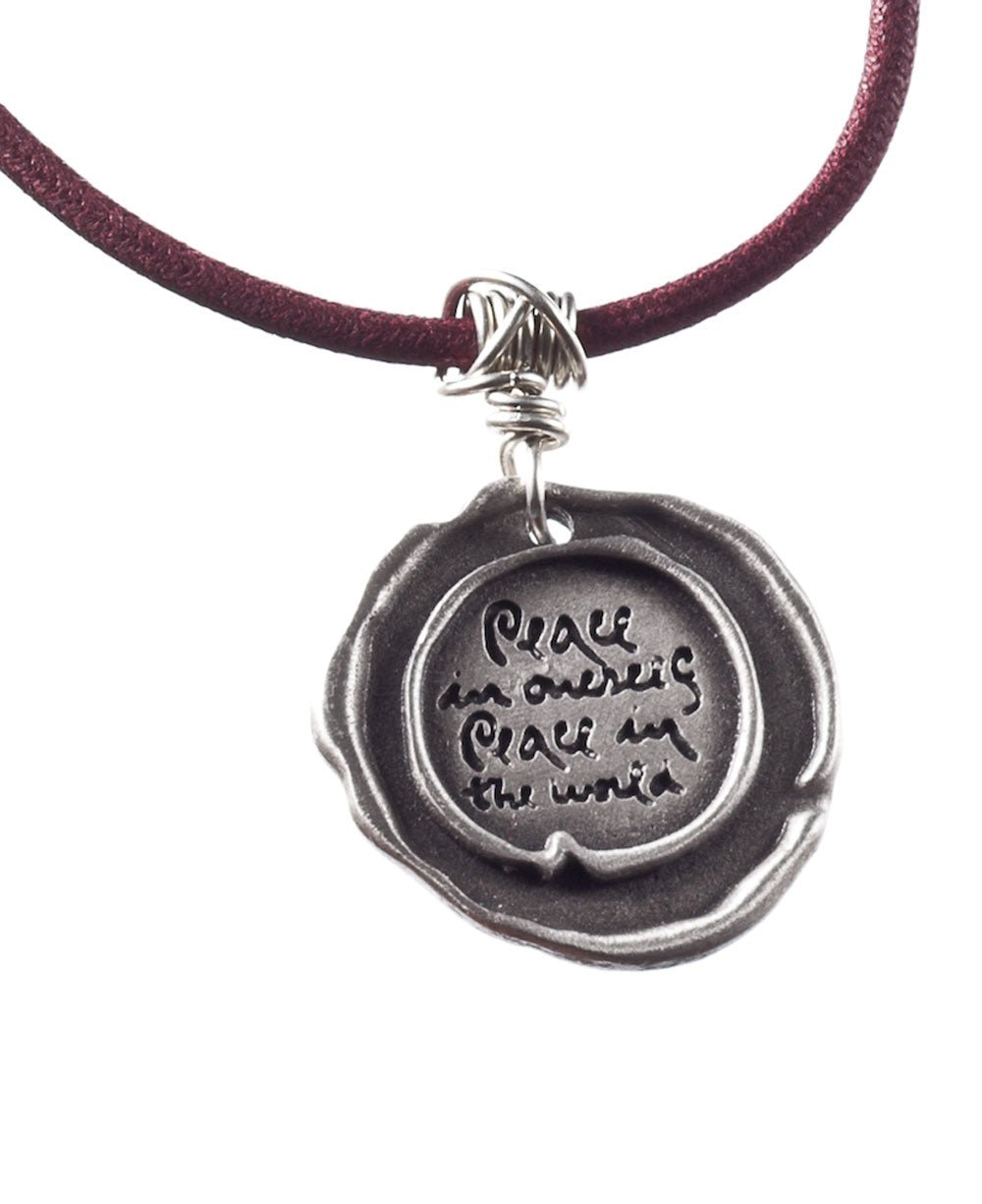 This pewter pendant necklace is a reminder that true peace resides within. The inscription, “Peace in oneself, peace in the world,” is taken directly from the teachings of revered Zen master Thich Nhat Hanh, whose own calligraphy serves as the blueprint for this unique line of necklaces. When worn around the neck it is a reminder to always look inwards before seeking outside solutions to problems and obstacles. Pewter seal measures 1 x 1 inch. A plum rope cord (in honor of Thich Nhat Hanh’s “Plum Village” in the heart of France) with pewter slider can be adjusted up to 27 inches. Intended for delicate use. Not waterproof.