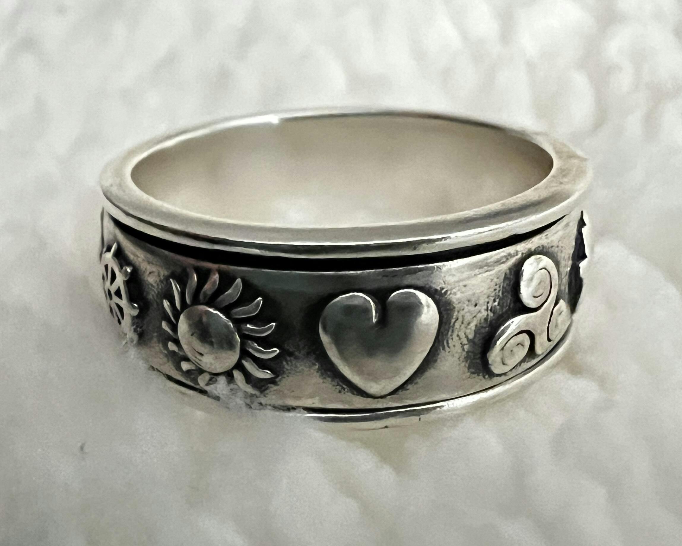 Soulful Symbols Spinner Ring – Sterling Silver Rotating Meditation Band - Size 6 is backordered and will ship as soon as it is back in stock.