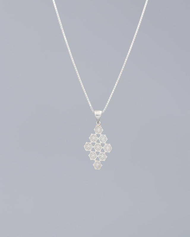9 tiny Flower of Life symbols form a simple diamond-shaped pendant—bringing ancient geometry into a modern silhouette. Suspended from a sleek sterling silver box chain, this necklace is both dainty and meaningful.