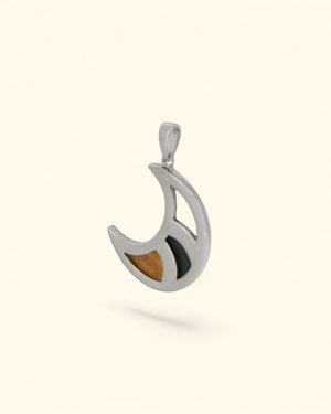 Channel the harmony of nature and cosmos with this elegant crescent pendant, a tribute to earth, sky, and spirit. Expertly crafted in rhodium-plated sterling silver, it features a modern geometric inlay of tiger’s eye, hematite, and mother of pearl—each stone imbued with symbolic energy and timeless beauty.