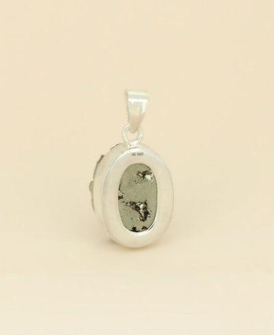 This sterling silver pyrite oval pendant is a harmonious blend of minimalist elegance and earthy charm. Featuring a captivating pyrite stone set in an oval-shaped frame, this pendant showcases and highlights the natural beauty of the stone.