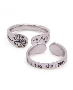 Design: Inspirational sterling silver ring inscribed with “This Too Shall Pass,” accented with symbolic dandelion motifs.