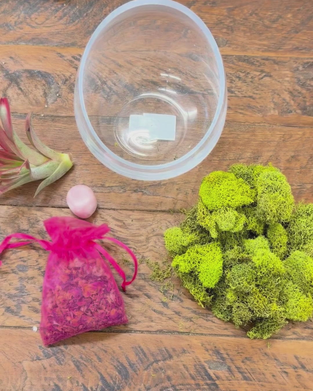 - Design: A glass terrarium filled with rose petals, green moss, a pink rhodochrosite stone, and a live air plant for a vibrant, healing arrangement.