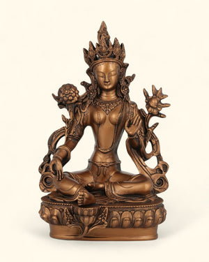 Invite tranquility and wisdom into your space with this exquisite Statue of Green Tara. Known as the embodiment of compassion and swift action, Green Tara is revered as the savior who alleviates suffering. Crafted with meticulous attention to detail, this statue embodies serenity and spiritual grace, making it a perfect centerpiece for any room.