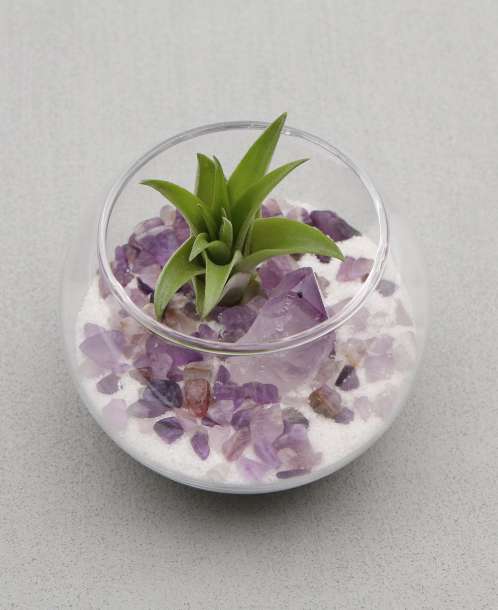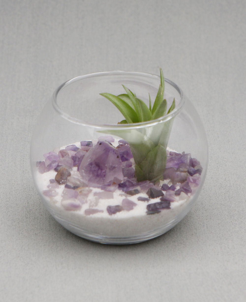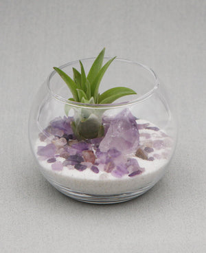 • Glass terrarium with a live air plant and amethyst rock