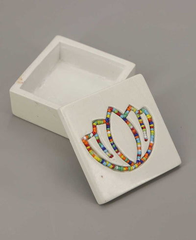 Hand crafted by the artisans in Kenya, these trinket boxes are made of natural soapstone in two color finishes. Depicting the lotus flower with the African beaded craft technique, the boxes are a perfect example of artistic infusion of cultures.