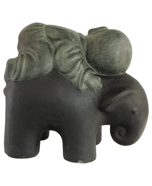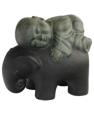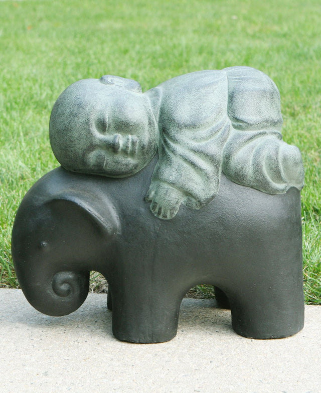 Bring a little tenderness to the outdoors. This statue of a baby monk resting on an elephant pulls right on your heartstrings! A gentle reminder of the love between humans and animals, this statue is made with a rustic finish in soothing colors of black and aged teal. The statue measures 18 inches wide, 16 inches high, and 9 inches deep. Weighs about 17 pounds.