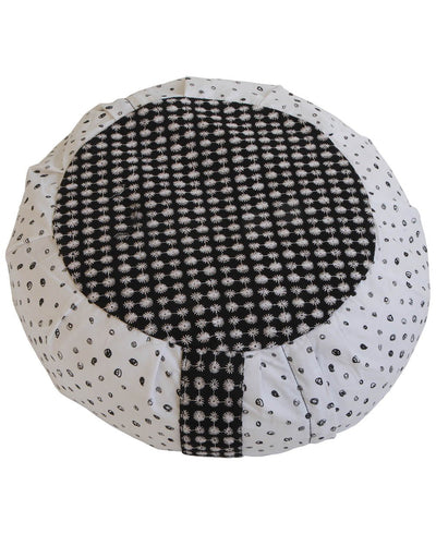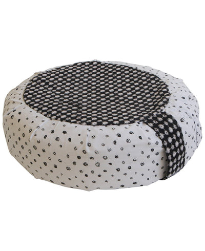 Two funky fabrics combine to create a unique look in a zafu cushion embellished with fun black and white patterns. An embroidered eyelet center is paired with a printed fabric of scribbled swirling designs. Measuring 16 inches across, its buckwheat hull filling provides firm yet flexible support for hours of sitting and breathing. Separate cotton cover is machine washable.