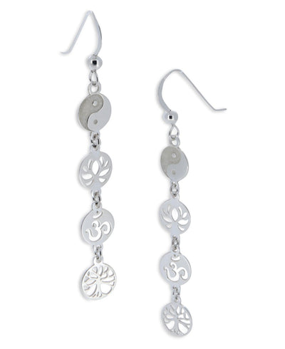 Four small discs with powerful symbols come together in these delicate link earrings: draw strength from each to inspire a life of tranquility and connection. Symbols are the Yin Yang, the Lotus flower, the Om symbol, and the Tree of Life. Crafted from sterling silver.