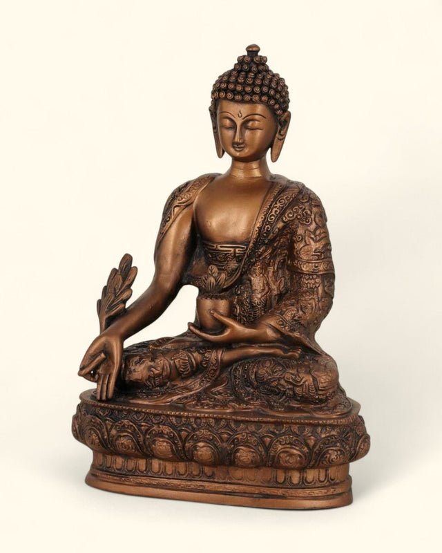 When Buddha is shown with a bowl of healing herbs and holding a myrobalan plant, he is regarded as Medicine Buddha. The Medicine Buddha represents Buddha's ability to heal all suffering, and his image alone is said to emanate therapeutic energy. With his detailed robe and antique colors of brown/bronze, this Medicine Buddha statue is a stirring presence in any space.