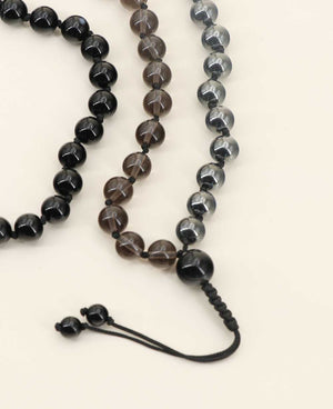 This hand-strung mala of 108 gemstone beads includes a combination of 54 black onyx, 27 hematite, 27 smoky quartz beads, and snow quartz stones. A black onyx guru beads completes the mala.