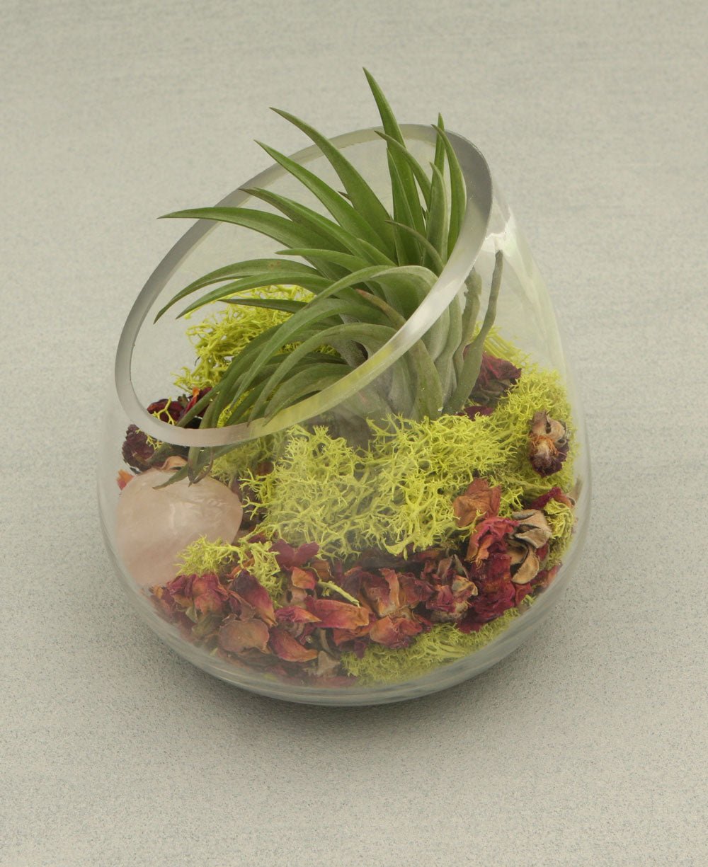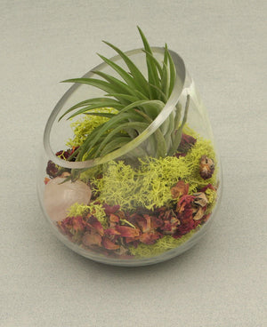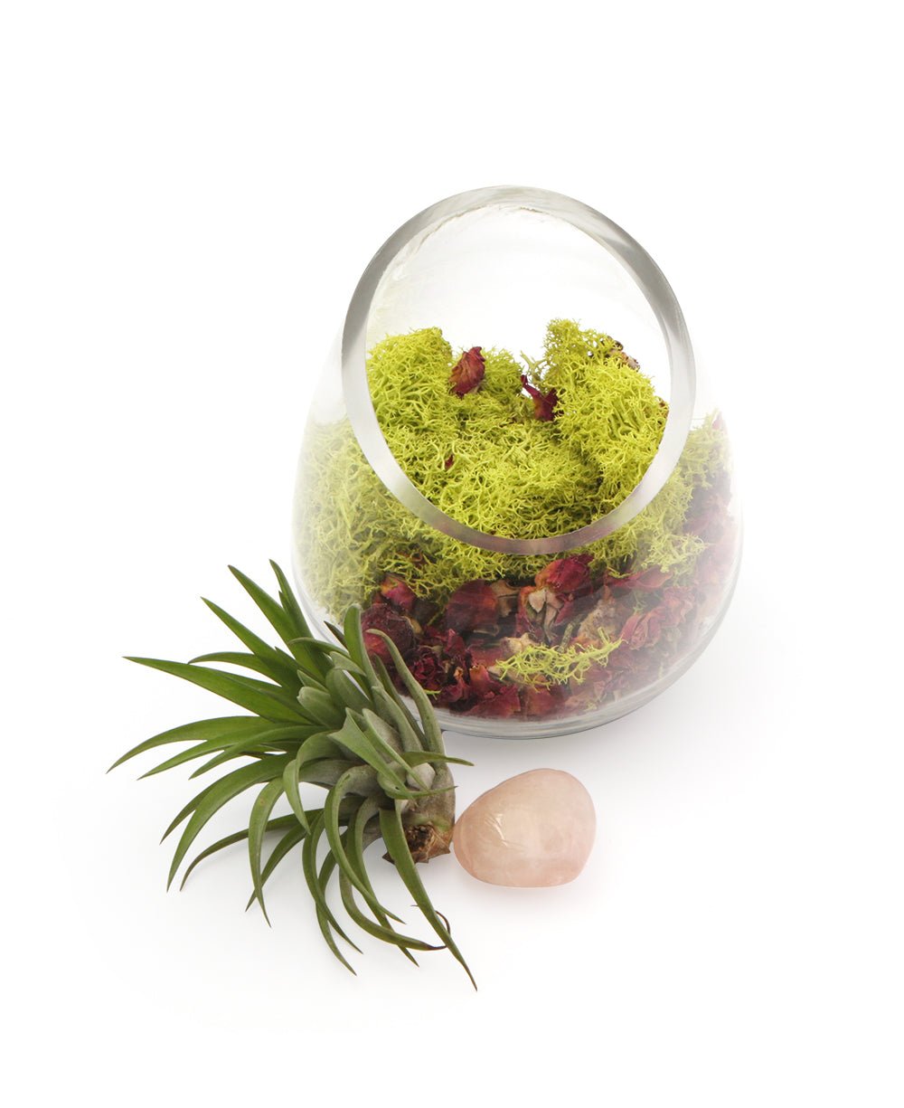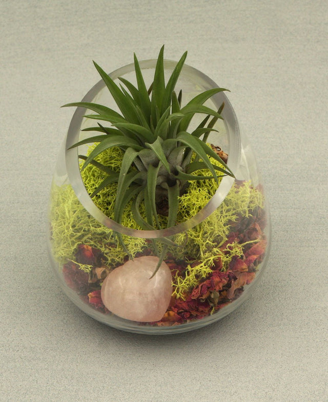 - Includes: Glass bowl, dried rose petals, moss agate chips, rhodonite tumbled stone, live air plant and preserved moss