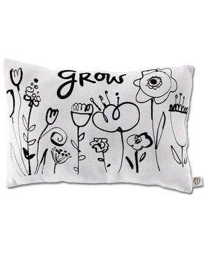 Be inspired to nurture and grow with the help of a secrete message hidden in the back of this delightful throw pillow. After admiring the hand-drawn qualities of its black and white design, flip it over and peek in the small pocket sewn onto the spring green fabric. There you'll find a tiny card printed with the words "We all grow stronger with sunshine and love." With such encouragement right under your pillow, you'll be sure to sleep soundly and thrive throughout the day.