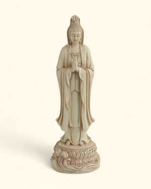A mother-goddess figure, Kuan Yin is considered the female manifestation of compassion. Depicted in a minimalist design over a lotus design pedestal she is a personification of serenity and calm.