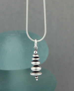A traditional cairn symbol gets an updated look with beads of sterling silver. Cairns represent guidance, direction, and hope for the journey ahead. Complete with an oxidized finish, this pendant is about 1.25 inches long total (Cairn is about 1 inch long, jump ring is about 0.25 inches long).