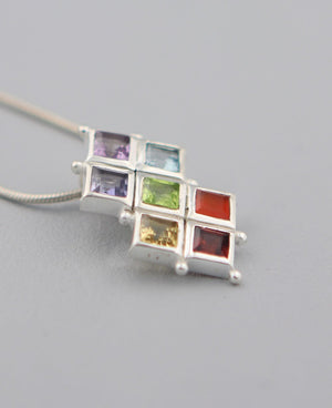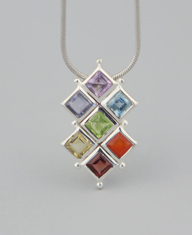 Set with seven chakra stones, this pendant creates a grid of balancing energies.
