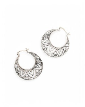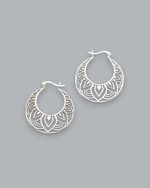 Inspired by the symmetry of mandalas and the elegance of the lotus flower, these sterling silver hoops showcase an openwork design. Their lightweight structure and secure latch-back closure provide effortless comfort and versatility.