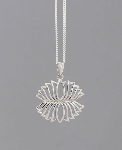 It is often said that blooming of a lotus flower reflects our own journey. Before a lotus can blossom, it has to rise above the mud signifying our own triumphs over adversities. Depicting the concept of reflection this lotus pendant is made of sterling silver.