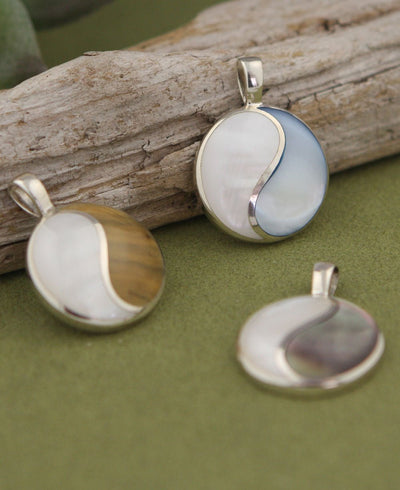 A beautifully abstract Yin Yang pendant is available in your choice of three different colors. The Yin Yang is highly symbolic, showing that not all opposing forces need conflict or clash. Rather, they can reach a harmonious balance. Choose from dyed Mother of Pearl in blue or grey or select a piece with Mother of Pearl and brown Tiger's Eye stone.